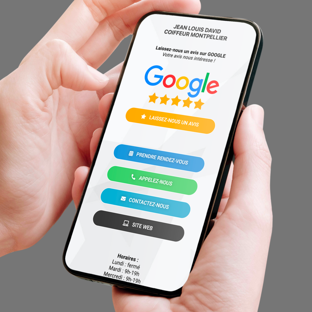 Cette page centralise toutes les informations essentielles de votre salon (horaires, contact, réseaux sociaux…), permet à vos clients de laisser un avis Google facilement ainsi que de programmer leurs prochains rendez-vous en ligne (via planity ou autre service de réservation).