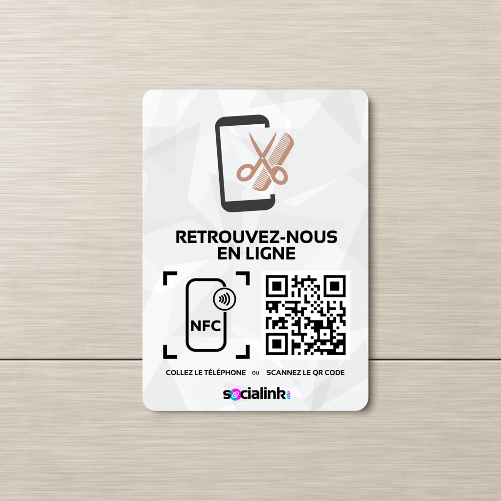 À placer dans votre établissement, permettant à vos clients d’accéder à votre page SOCIALINK personnalisée via QR code ou NFC (sans contact). Une porte ouverte vers votre univers digital.